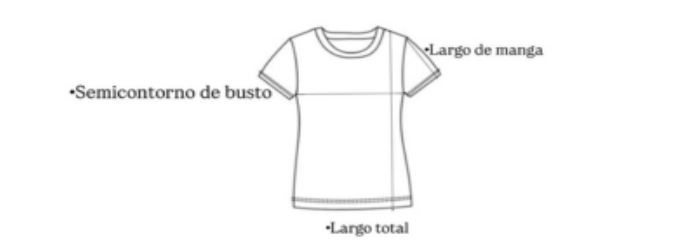 semi contorno de busto: midiendo con la prenda estirada en una superficie plana de axila a axila. Si a ese número lo multiplicamos x2 nos va a dar como resultado el Contorno de busto total